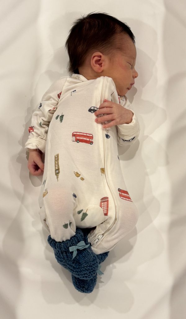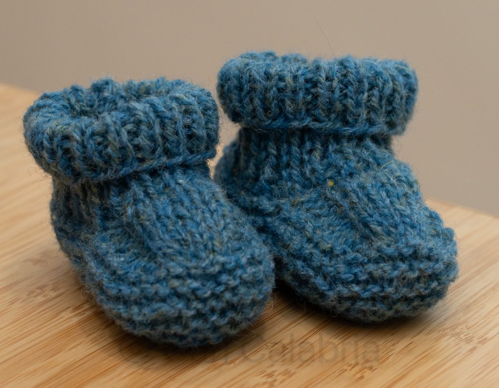 While Maya was visiting over the Christmas break, she knitted a pair of booties for a colleague who was expecting a child. That baby arrived on Christmas Eve, and today Maya shared this photo of the new arrival in his cozy footwear.