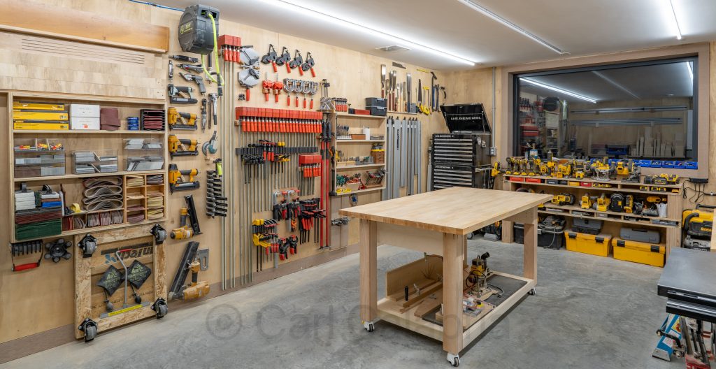 Because of the increased bench width, I decided to relocate my tool chest from the “clamp wall” to the northeast corner, reclaiming 20 inches of clearance for the back side aisle. I added two low-profile shelving units (made from remnants of a kitchen island we replaced while living in Indianapolis). The one on the left will be used to store sanding and pneumatic nailing consumables. The one on the right will be used for frequently used hand tools and hex shank bits for my cordless drivers. Finally, I will relocate all of my layout and measurement tools from the tool chest to the bench drawers, making them immediately accessible.