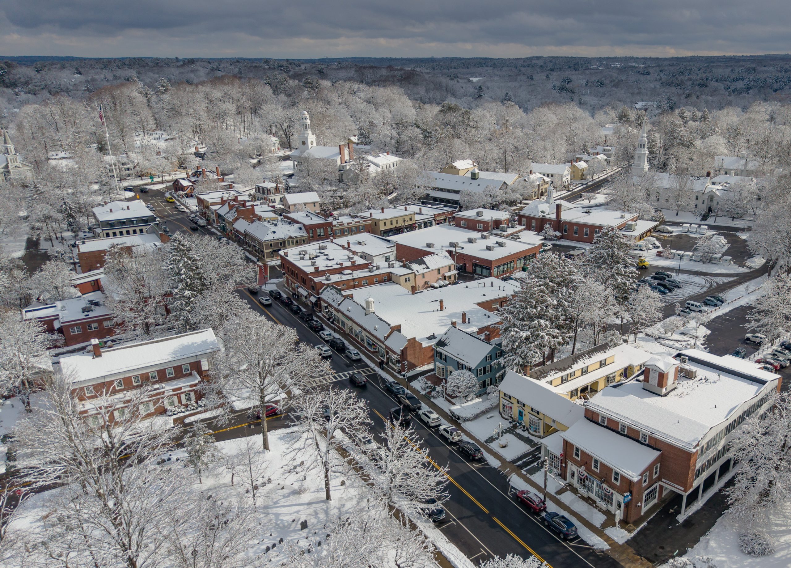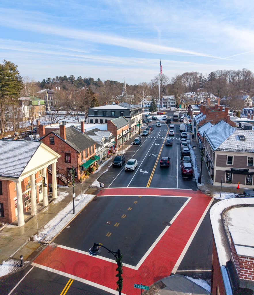 After recent street work, downtown Concord’s pedestrian crosswalks got a bright new coat of paint. I like the bold color, but I question the need for a trapezoidal outline to define a “T” shaped intersection. Try as I might, I have yet to find an aerial perspective that “captures” the essence of our downtown area. Perhaps that is what makes it so quaint.