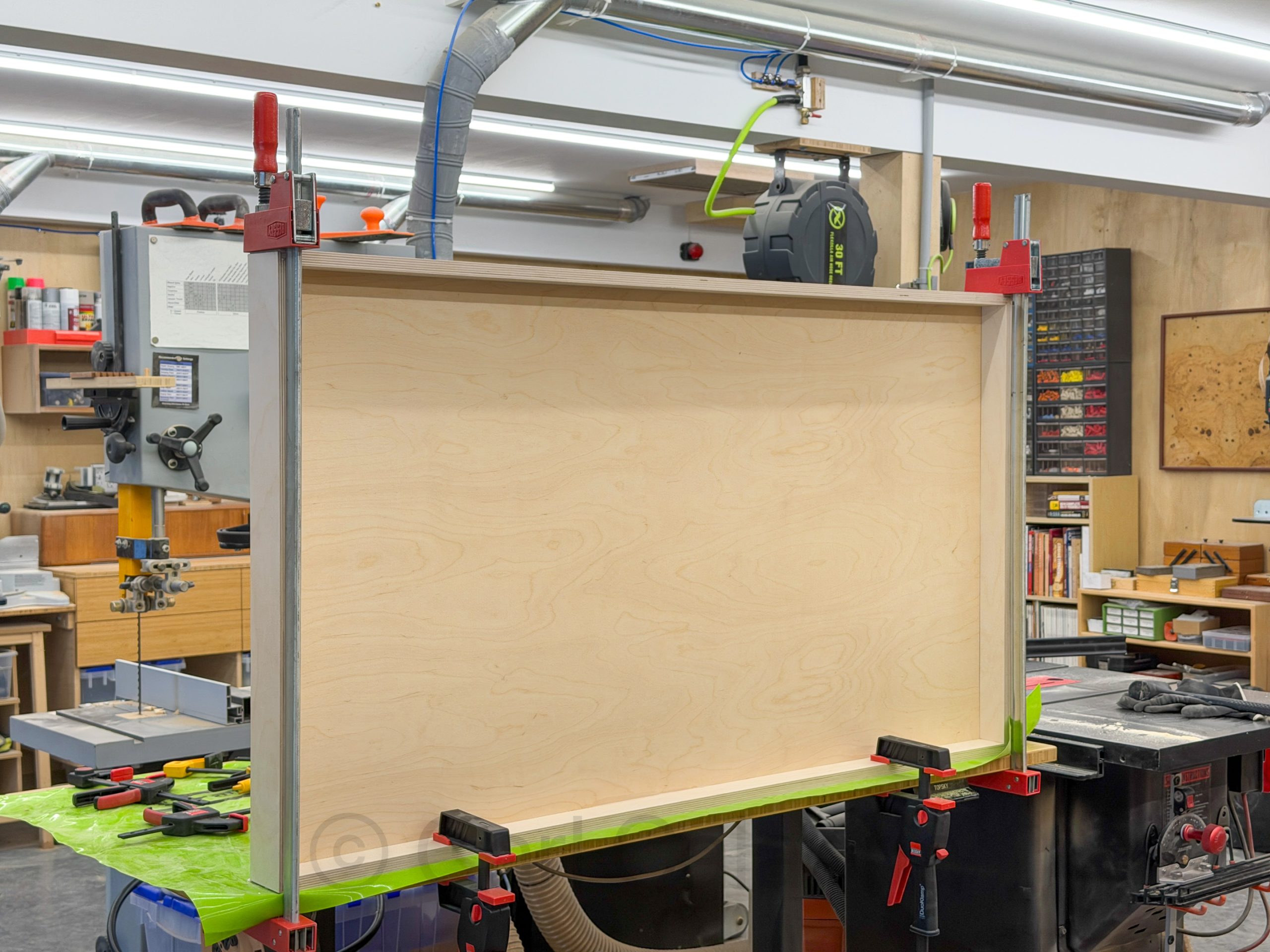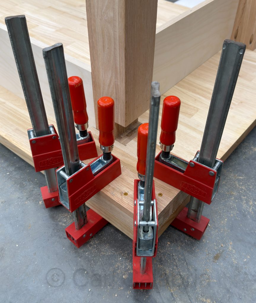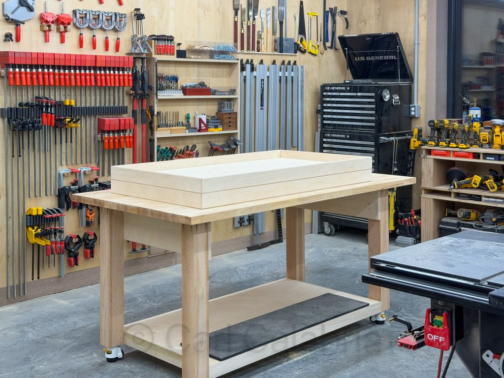 It has been two years since I last made improvements to my shop, a process I call shoptimization. Over the last few days, I have completed another round triggered by my desire for a larger assembly bench. The new bench is 72″ x 39″ compared to my previous bench which was 60″ x 30″. The top and legs are made of solid oak, and the bottom shelf has poplar sides and a Baltic birch surface. I have yet to complete two massive full-extension drawers (53″ x 30″ x 3-1/2″) that will sit immediately under the top. The legs and drawers will be set back from the edge by 3-1/2″ to allow for clamping, and I will add a 10-1/2″ vise to the back left corner. The legs are fitted with ratcheting levelers that double as mobility casters.