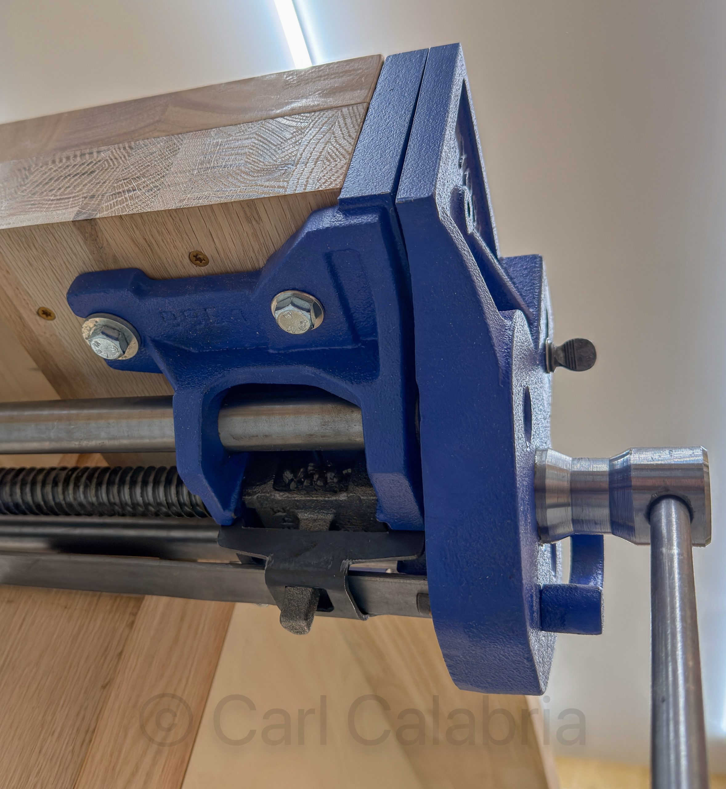 The vise for my new assembly table arrived today, and I made quick work of installing it. Designed for a 3-1/2″ benchtop, I had to glue and screw a 2″ spacer to my 1-1/2″ top to make up the difference. I also notched one of the table legs to create clearance for the vise’s sliding rails. Alternatively, I could have located the legs on this end of the table further from the edge, but I preferred this approach to minimize the tabletop overhang and to maximize the width of the drawers yet to be installed.
