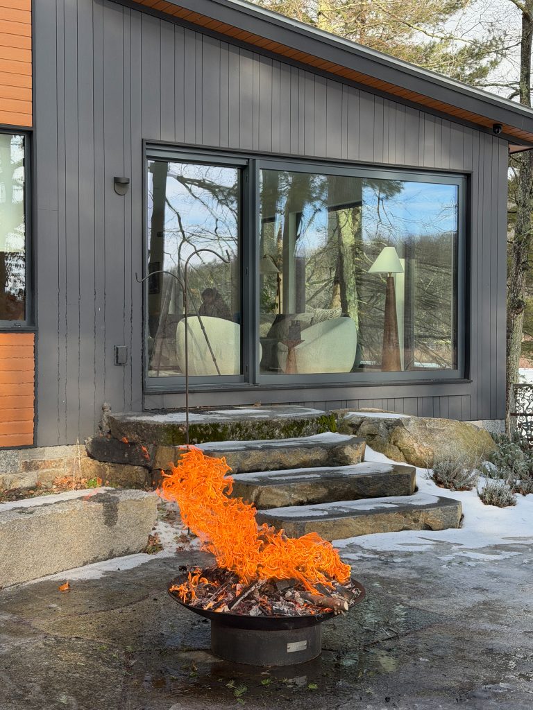 Mild temperature and minimal wind made for good conditions to burn off our Christmas tree, which took all of ten minutes. Once I had the fire started, I added wood scraps from the shop and broken-down palettes to create a lovely spire.