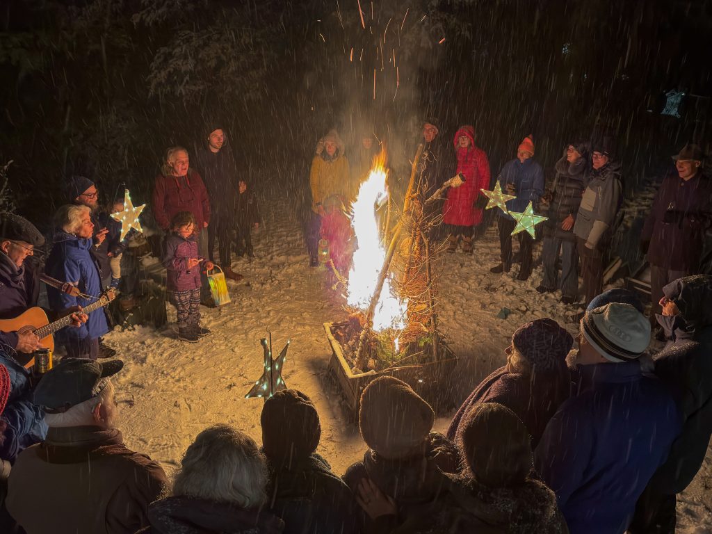 In the evening, I attended a winter solstice party at our neighbors’ just up the street. It was originally scheduled for the celestially correct night last December, but had to be postponed due to the illness of one of the hosts. The evening included an outdoor fire lighting ceremony and sing-along. I retreated to the back of the circle, performing a thoughtful public service by ensuring my “singing” remained a strictly personal experience.