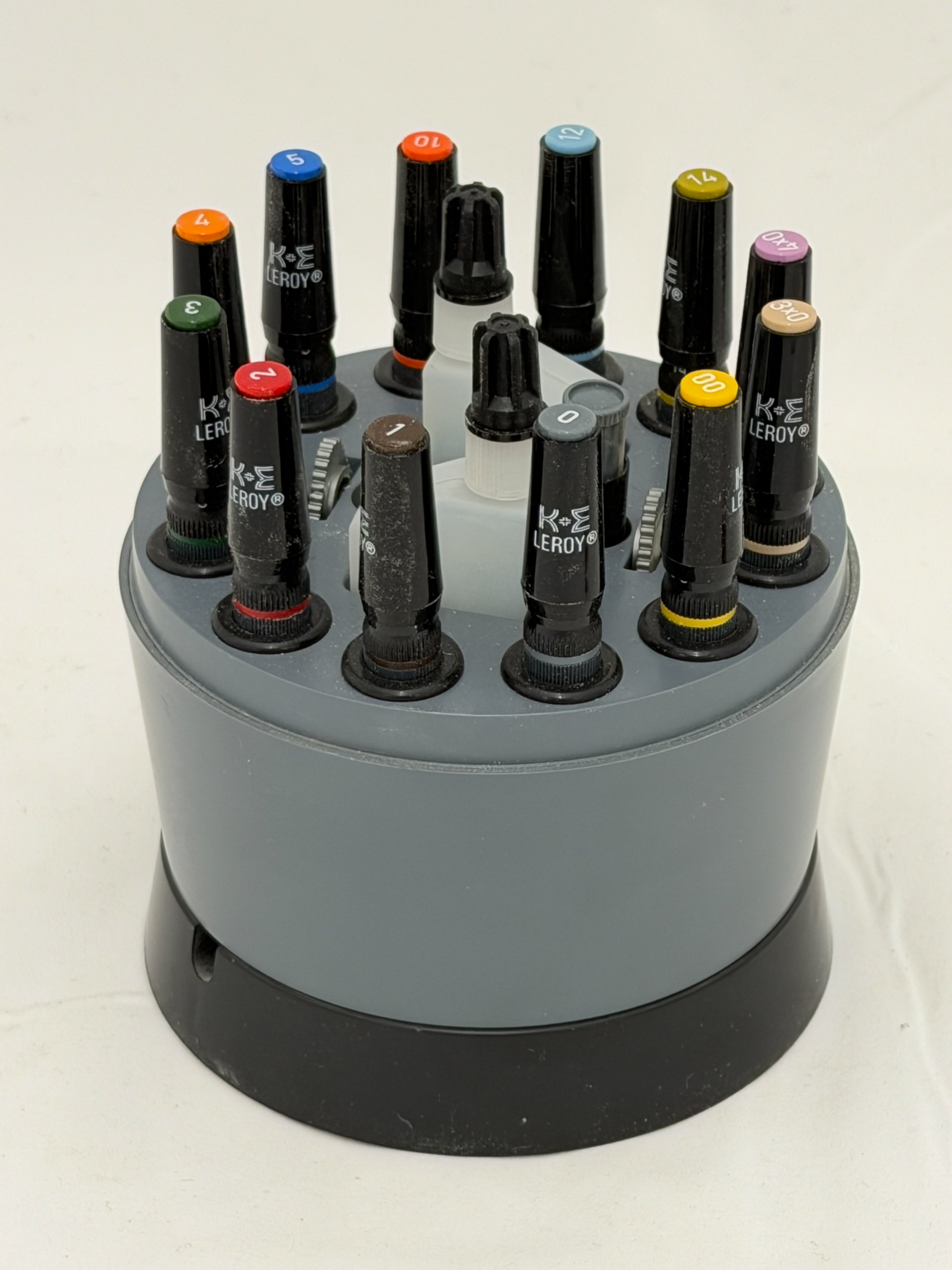 When I was in high school, I did math on a slide ruler and personal computers did not exist yet. The conduit of design communication was an engineering drawing, commonly prepared on a drafting table with pen and ink on velum. Pictured above is the set of 12 pens of various sizes that I used for such drawings. When I came across them today while organizing some drawers in my shop, I was immediately transported to my 11th-grade drafting class, where I have fond memories of perfecting my drawing technique, a skill that still serves me well today.