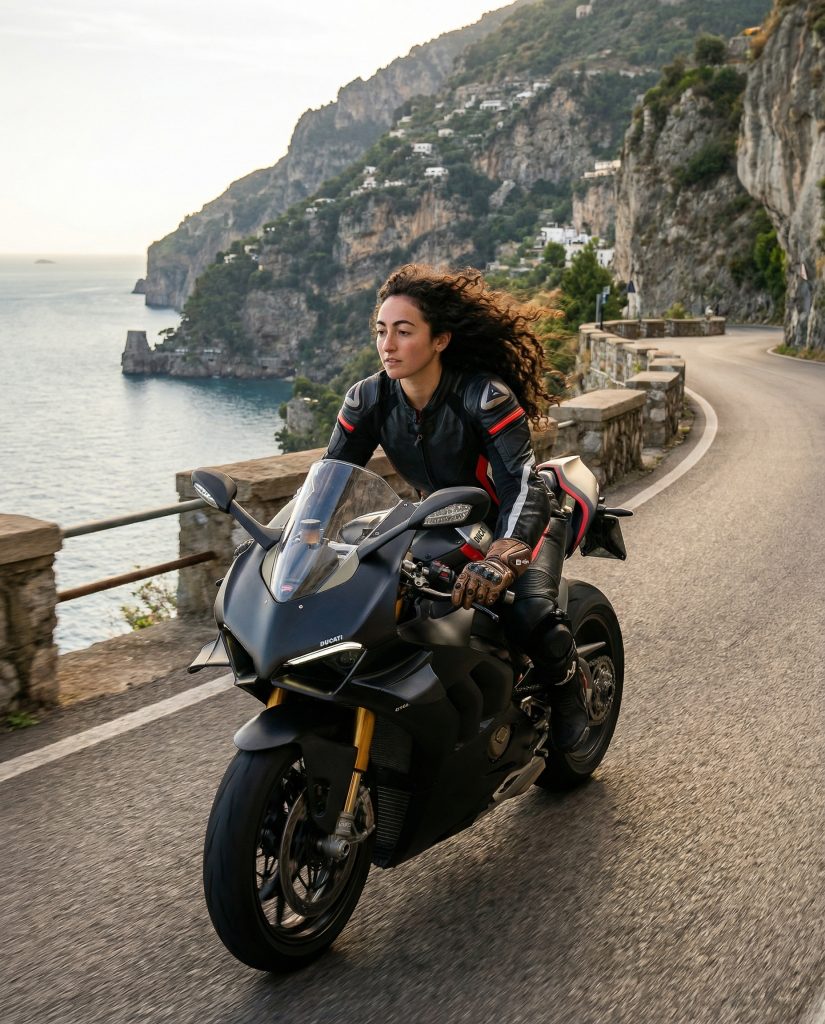Every time I look at this image of Maya, I am bothered by the fact that she is not wearing a helmet. Riding a motorcycle is dangerous enough. Doing so on a winding road next to a sheer cliff only adds to the risk. Failure to wear a helmet is where we cross the boundary into recklessness and questionable intelligence. On a positive note, the leather suit and gloves are a good choice.