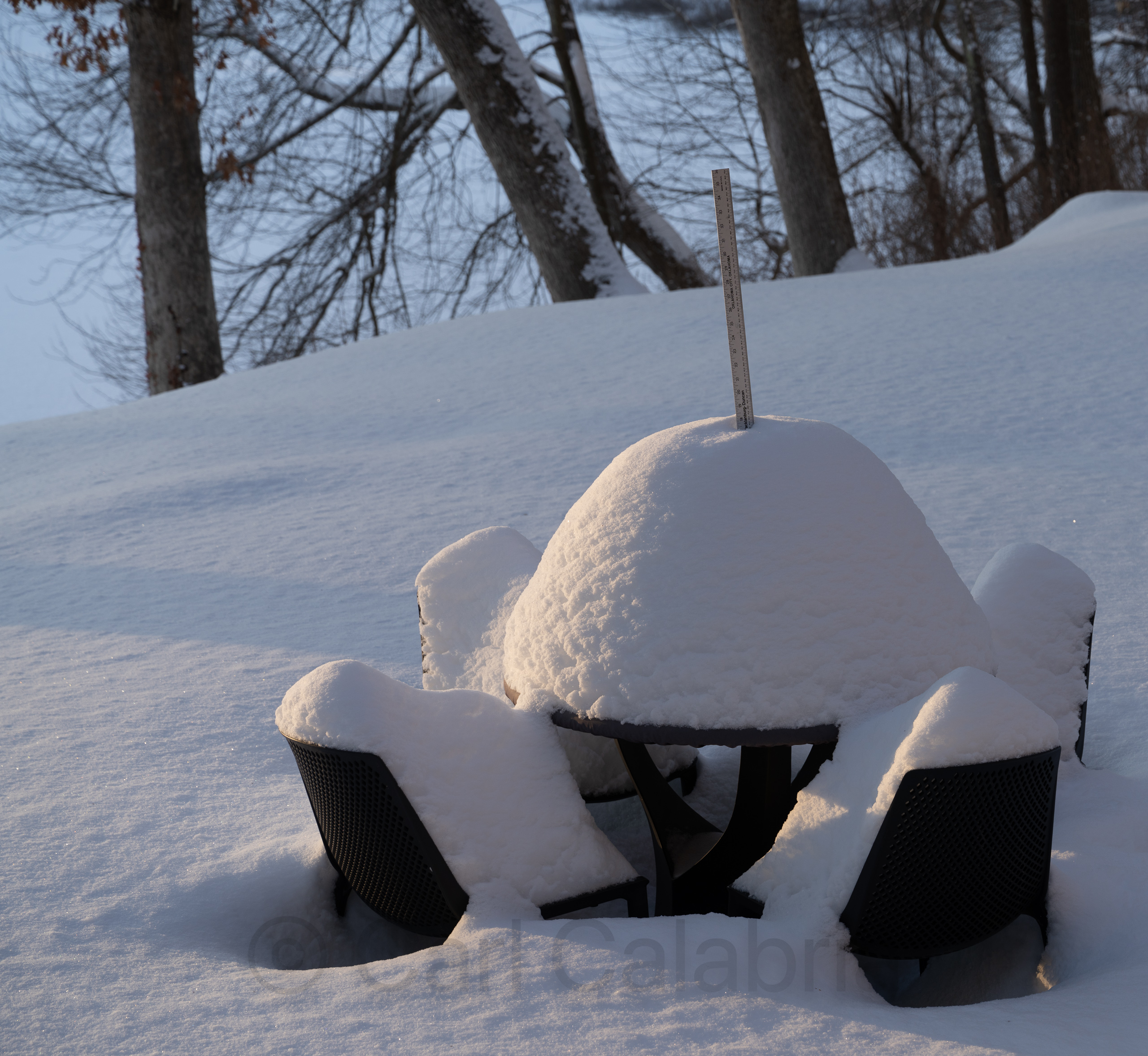 We woke up this morning to 14″ of fresh snow with two more expected this afternoon. The ruler placed in the snow mound on our outdoor bistro table indicates 18″, but there was already a 2″ base before this latest storm started. Clearing all the snow provided a great workout. Digging out both of the boys’ cars proved the most time-consuming part of the job.