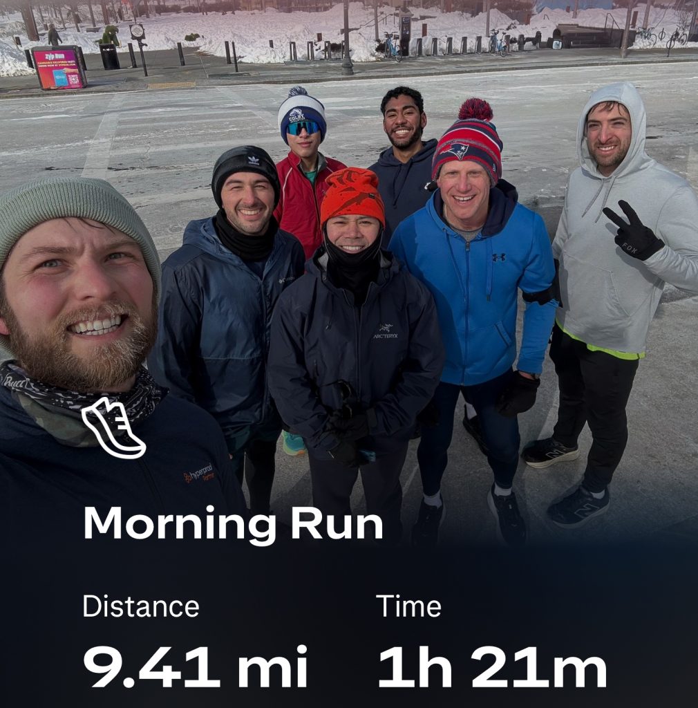 Kyle shared this photo and map of his running group/route after completing their morning workout. Not recorded was the temperature or wind chill, which was brutally cold. We are informed that he followed the run with a long soak in the hot tub at his gym.