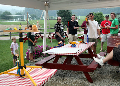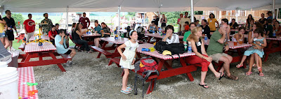 This evening we attended the Sonos Summer Celebration held at Kimball Farms. Nicolai left for Encore Coda music camp earlier in the day so he was not able to join the family appreciation outing. Despite some brief periods of intense rain the event was a great success. This being the first Cambridge based company gathering since my arrival, I was very keen to take full advantage of the event to build an even closer knit team. For an ice breaker, Maya assisted by sticking labels with the names of taco ingredients on them to each attendees back. Each person was asked to circulate in the crowd and ask yes/no questions to determine what their label said. Having done this, I informed the participants that the first team to form a complete taco (shell, chicken, lettuce, tomatos, salsa, cheese) and sit at a table with their hands up would win the prize.