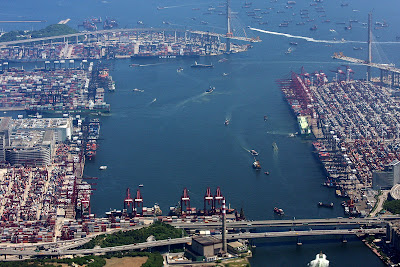 The port is a beehive of activity filled mostly with huge container ships carrying manufactured goods to the rest of the world. Click on the photo for an enlarged view and see how many cargo vessels you can spot. Also notice the new suspension bridge under construction.