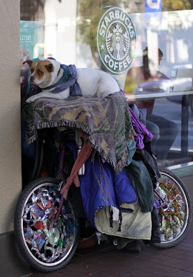 Frequent visitors to this site know that my monthly trips to Santa Barbara routinely give rise to bizarre postings. This morning I walked past this scene on my way to work. I am at a loss to explain why there is a dog sitting on this bicycle. It is possibly some new type of security device. Then there is the matter of the bike itself. No answers, just questions.