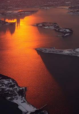 I left my Santa Barrbara hotel at 5AM this morning and arrived in Boston just in time to catch a magnificent sunset. Even more spectacular than the sunset was its reflection off the water as seen from the air.
