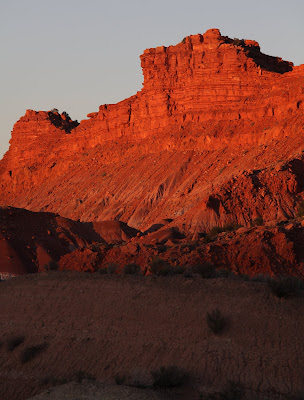 From LA I fly to St. George, Utah where I rent a SUV. Instead of the high clearance, 4WD vehicle I specified, my only choice is a 2WD SUV wannabe with a low hanging air dam. This unfortunate situation will impact my ability to reach some of my planned destinations. As I drive towards Page, AZ I stop at a hardware store to purchase a shovel, correctly anticipating how essential this will be for self extrication should I get stuck in the middle of the desert somewhere. I was in the vicinity of the abandoned town of Old Paria as the sun was setting and made a quick detour to capture this image (no post processing, color is true to the scene) and also elected to spend the night there. The town was originally settled by Mormon farmers who were followed by gold miners when flash floods destroyed the farm land. More recently it was used as a location for filming Western movies but vandals burned down the sets years ago and now it is just a beautiful destination at the end of a dirt road. Although I came prepared to sleep in my tent, I opted to sleep in the SUV (its single virtue being adequate space with the rear seats folded flat for me to stretch out diagonally across the cargo area). Sleeping in the SUV was no less comfortable than in the tent and saved me setup and tear down time each day. I could roll out of my sleeping bag and be on the road in under a minute.