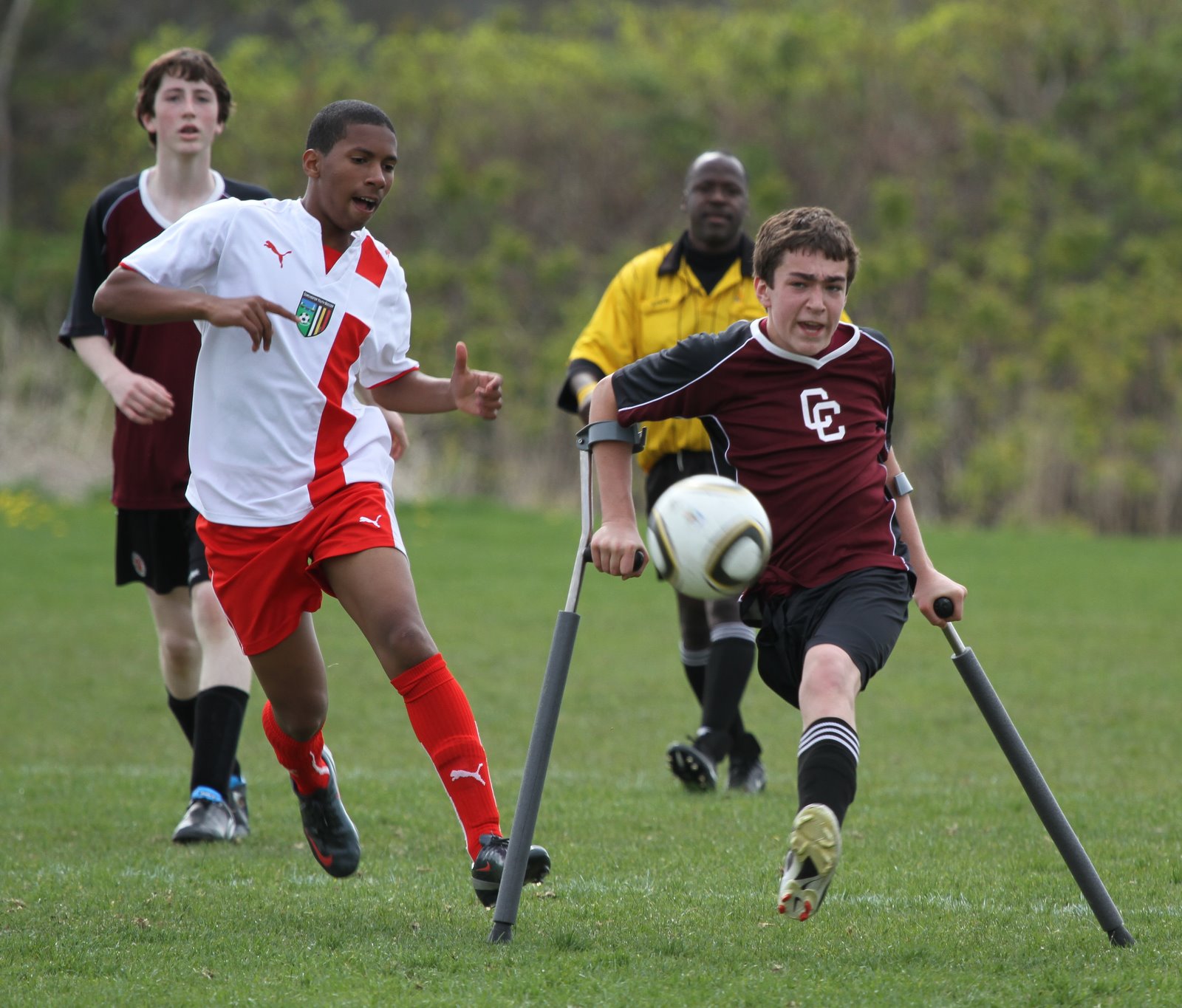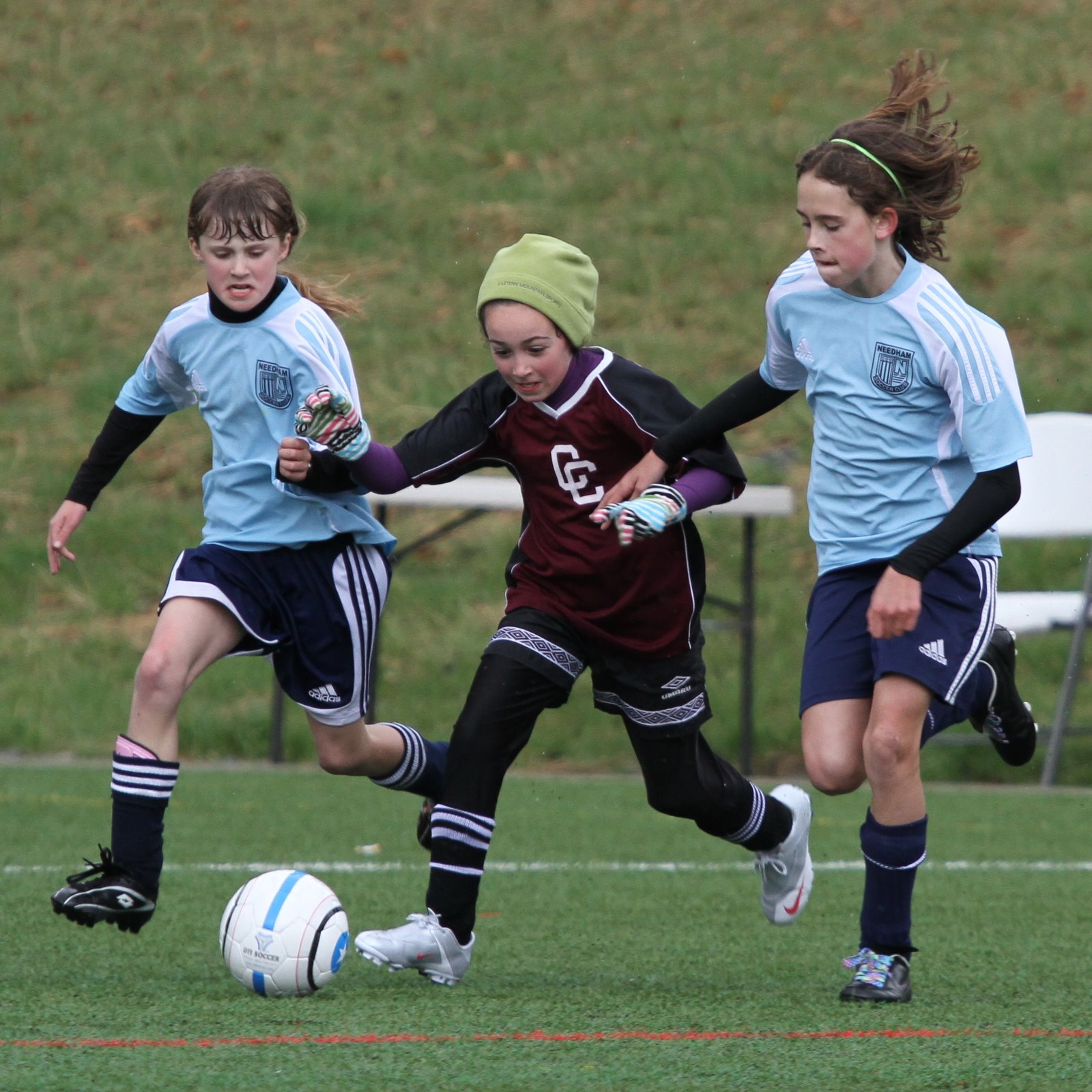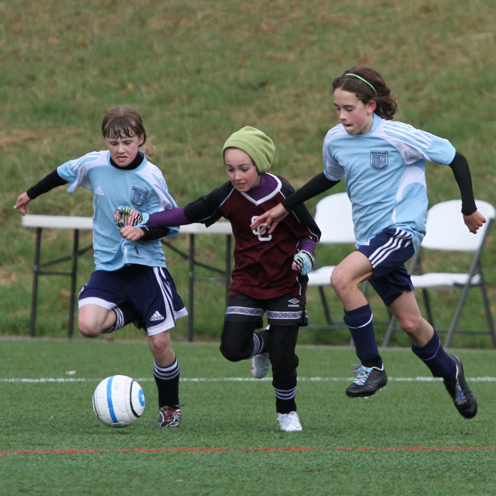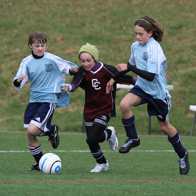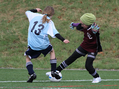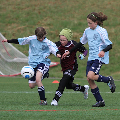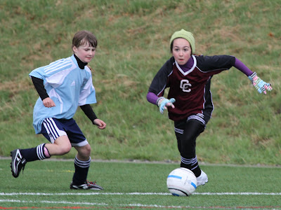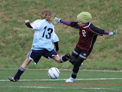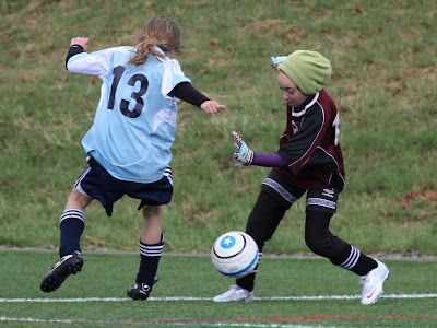 Later in the game, while playing as a midfielder, Maya splits two considerably larger defenders and makes a full field run up the touch line beating an additional two defenders during her attack. What she lacks in size she makes up for with grit and intensity. Her team won with a late score by a margin of 3-2.