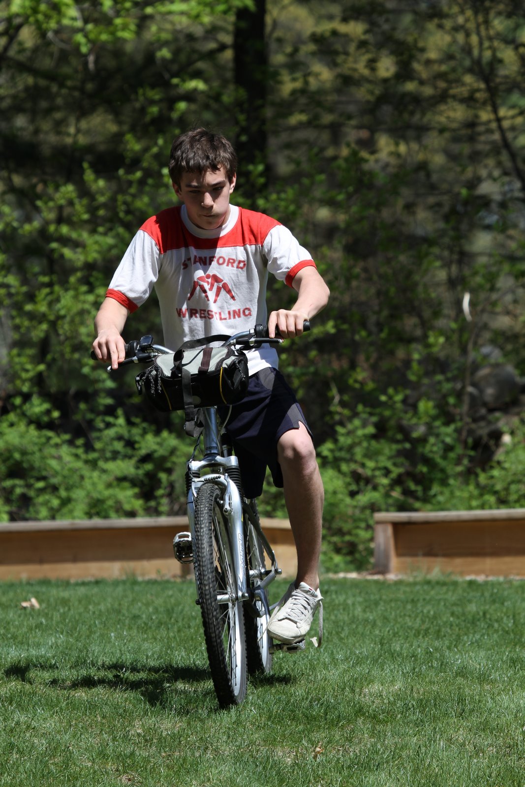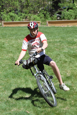 Ice skating, mountain climbing, wrestling, dancing, kayaking, gymnastics, rollerblading, skiing, rock climbing, playing soccer, volleyball, basketball and tennis are among the activities Nicolai has mastered. Today he added riding a bike to the list. He will probably graduate directly to driving a car but I am glad he had the courage to conquer the one skill that remained on the list of challenges he has not overcome. It took him all of about ten minutes to get the hang of it. In order to become fully proficient he will need either a clip in shoe or a toe clip.
