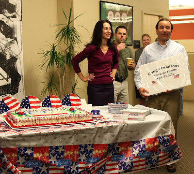 On Wednesday mornings at iRobot we have a brief stand up meeting for the whole division called a huddle. It is a time we use to give brief presentations and introduce new employees. Today we honored Oscar, our VP of Operations, who last week became a US citizen. Born is Colombia, he is one of the nicest guys you will ever meet and has been instrumental in the recent success of the company.