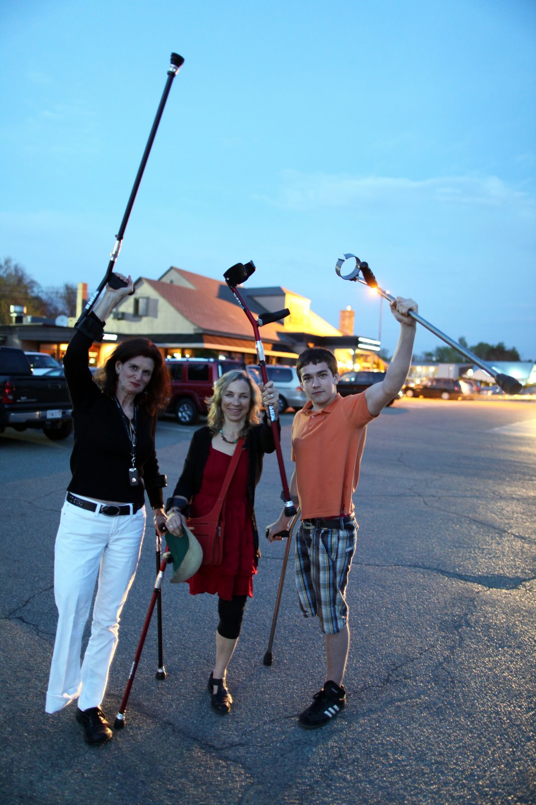 This evening we were treated to dinner by SideStix founder, Sarah Doherty (center). Her company makes a new generation of sport crutches which Beverly (left) and Nicolai helped to field test. It is not everyday that you see three people with a missing right leg. More rare is that two of them are the only people to ever climb Mount Kilimanjaro on crutches.