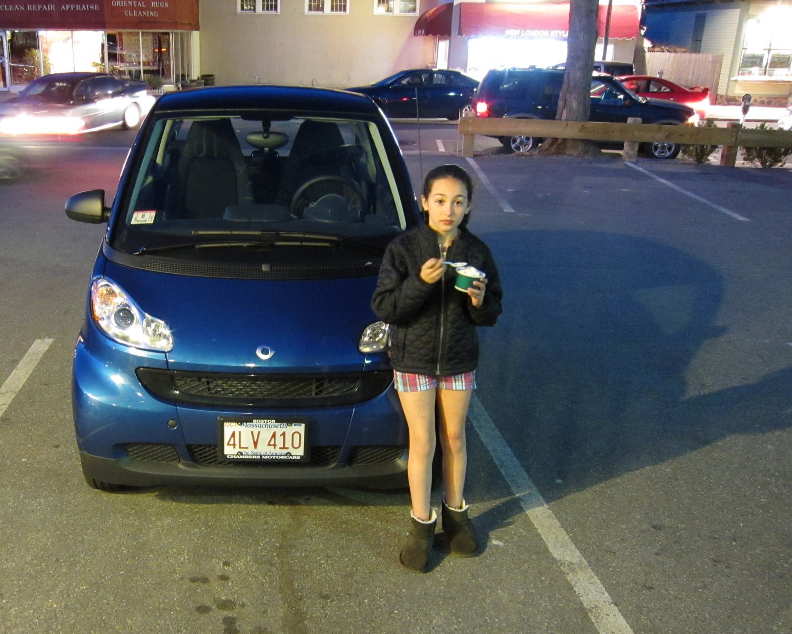 Jeanine and Kyle departed this morning on an extended college visit road trip which will take them through Connecticut, New York, and Pennsylvania. They elected to take my car because of the built in navigation system leaving me with the Smart Car, the smart child and her older brother. This not-so-smart parent allowed the pictured child to drive the pictured car around the neighborhood (twice) before usurping control and heading out to the ice cream store for a little treat. Only lack of sufficient height prevents Maya from driving without me.