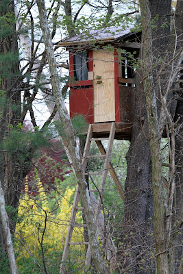 Maya and Nicolai collaborated on making additions to the tree house today. Their tree perch now features a split level hinged door with handles and curtains in the windows. I have yet to verify claims that my shop has not been restored to pre-project condition and that all tools have been returned undamaged. If true, I will be as pleased with their responsible behavior as with their construction efforts. The fact that all their digits appear in tact suggests they observed my ban on their use of the table saw but leaves me wondering how they cut the plywood to such close tolerances. I am looking forward to a closer inspection of their project in the morning.