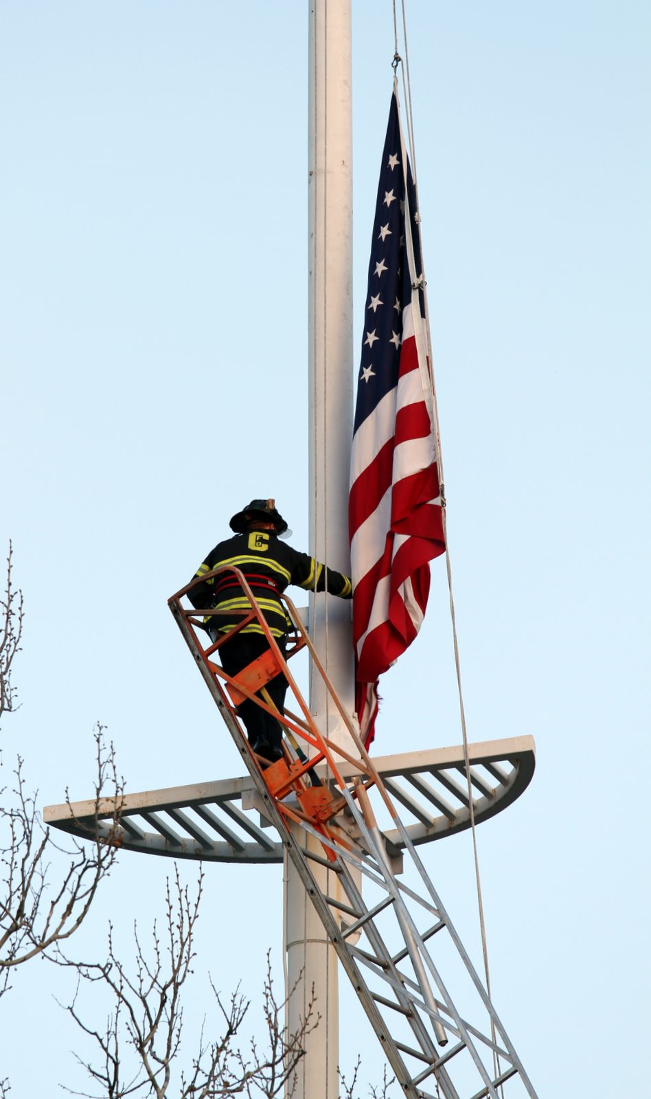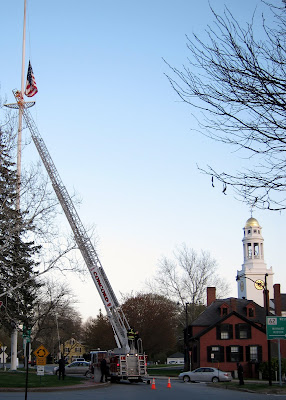 The Concord Fire Department was on the scene to rescue our town flag when attempts to lower it were thwarted by a tangle. I paused during my evening commute to look on as the CFD made quick work of the task.