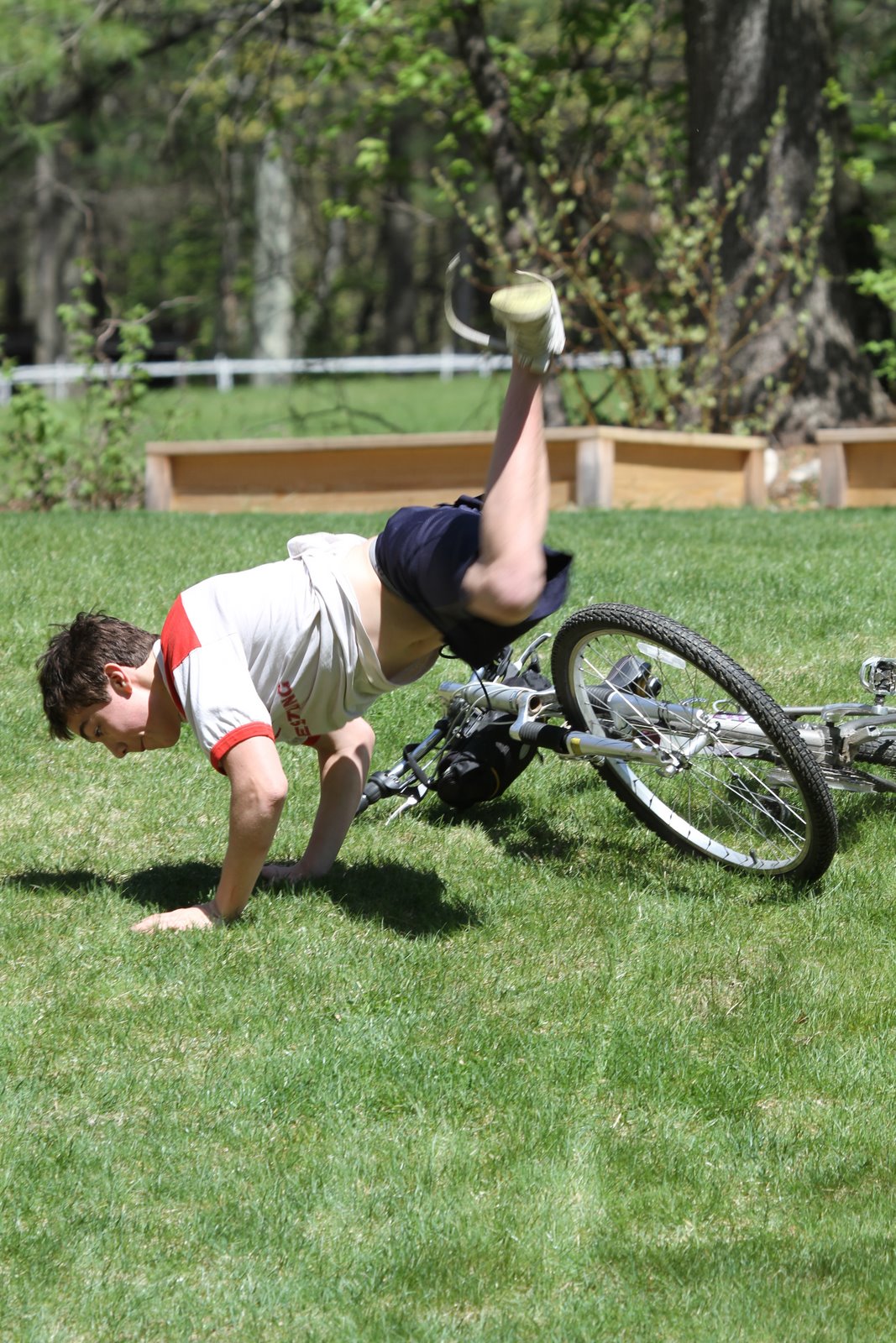 Although he progressed very quickly, his experience included all the normal consequences of learning to ride a bike. By practicing on the grass we minimized the potential for injuries and his cat like reflexes saved him from the rest. I was very proud of Kyle who encouraged Nicolai all the way and repaired the bike as was often necessary after a crash.