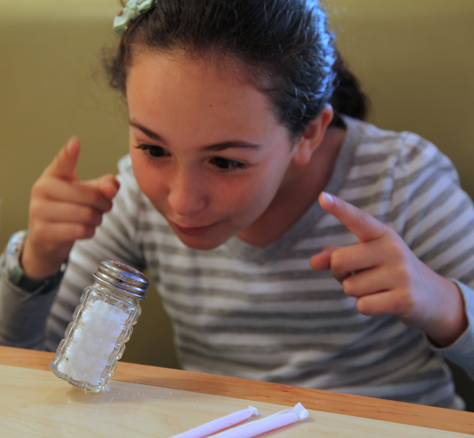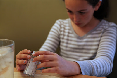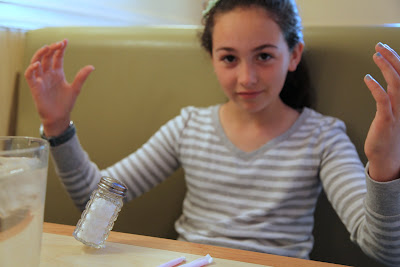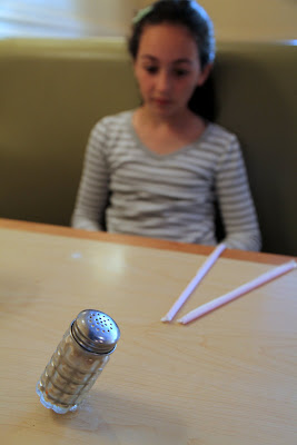 Jeanine was attending a conference all day so I had an early father-daughter dinner with Maya before dropping her off for a birthday slumber party. We took turns balancing the salt and pepper shakers. It takes a bit of patience but achieving the goal is very satisfying.