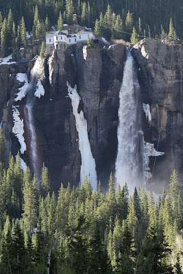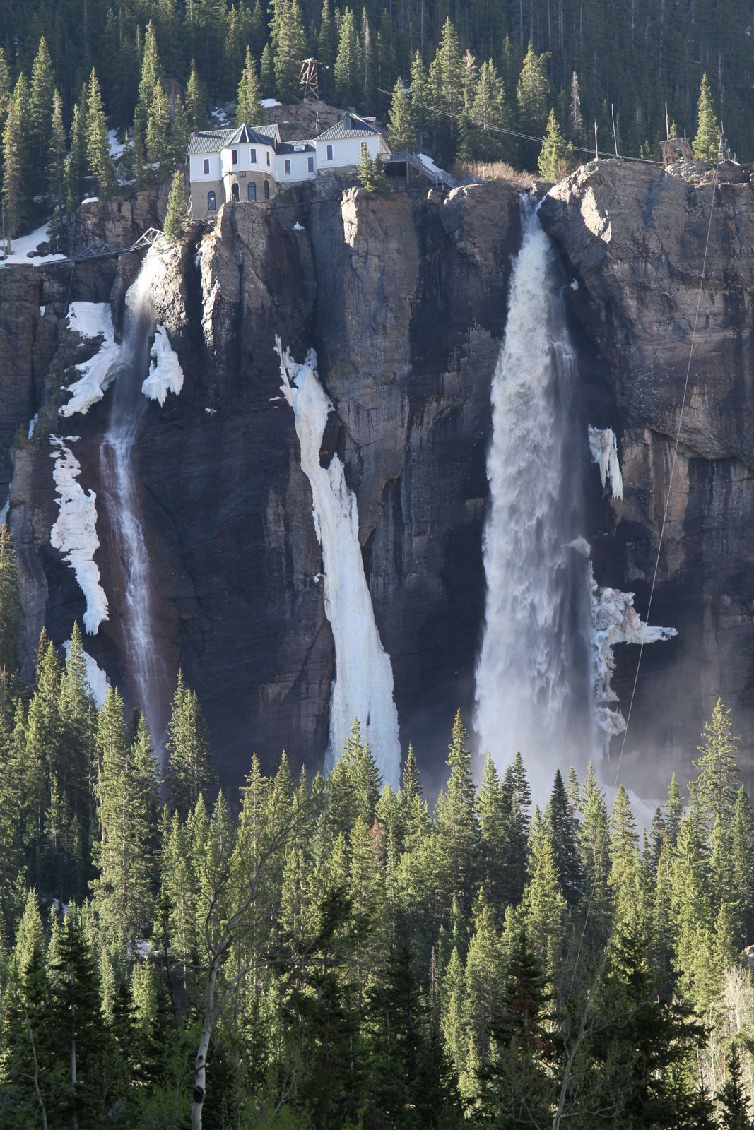 With no speaking responsibilities today we elect to take in a little photography and make the short drive to the end of the box canyon in which Telluride is situated. Here we are treated to a view of Bridal Veil Falls which are full with spring runoff on this warm and sunny day. This two pronged waterfall is the tallest free standing in Colorado at 365 feet and is capped with a power generating station which produces 25% of Telluride’s electricity. The marmots here are abundant and show little respect for the law.
