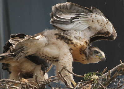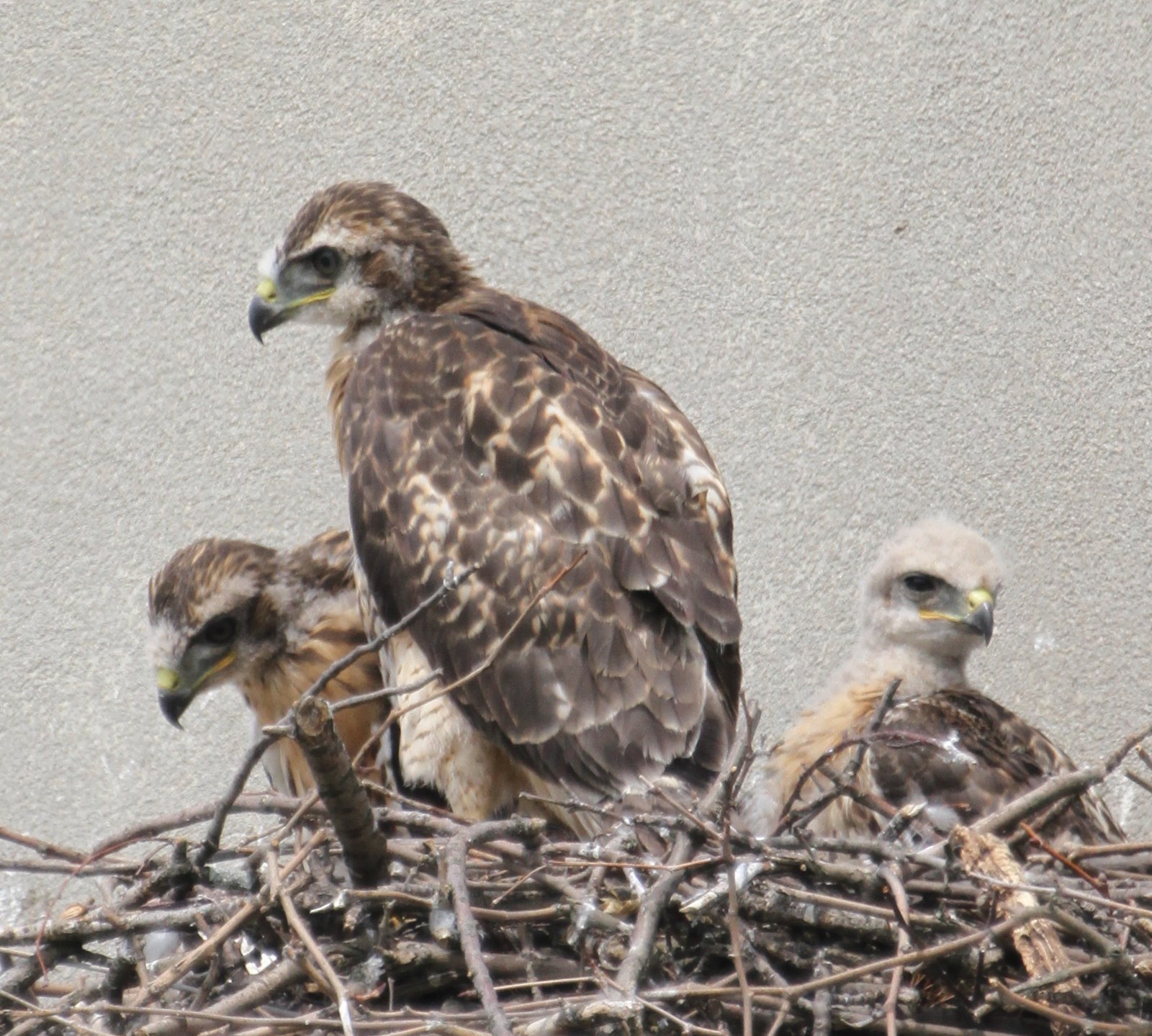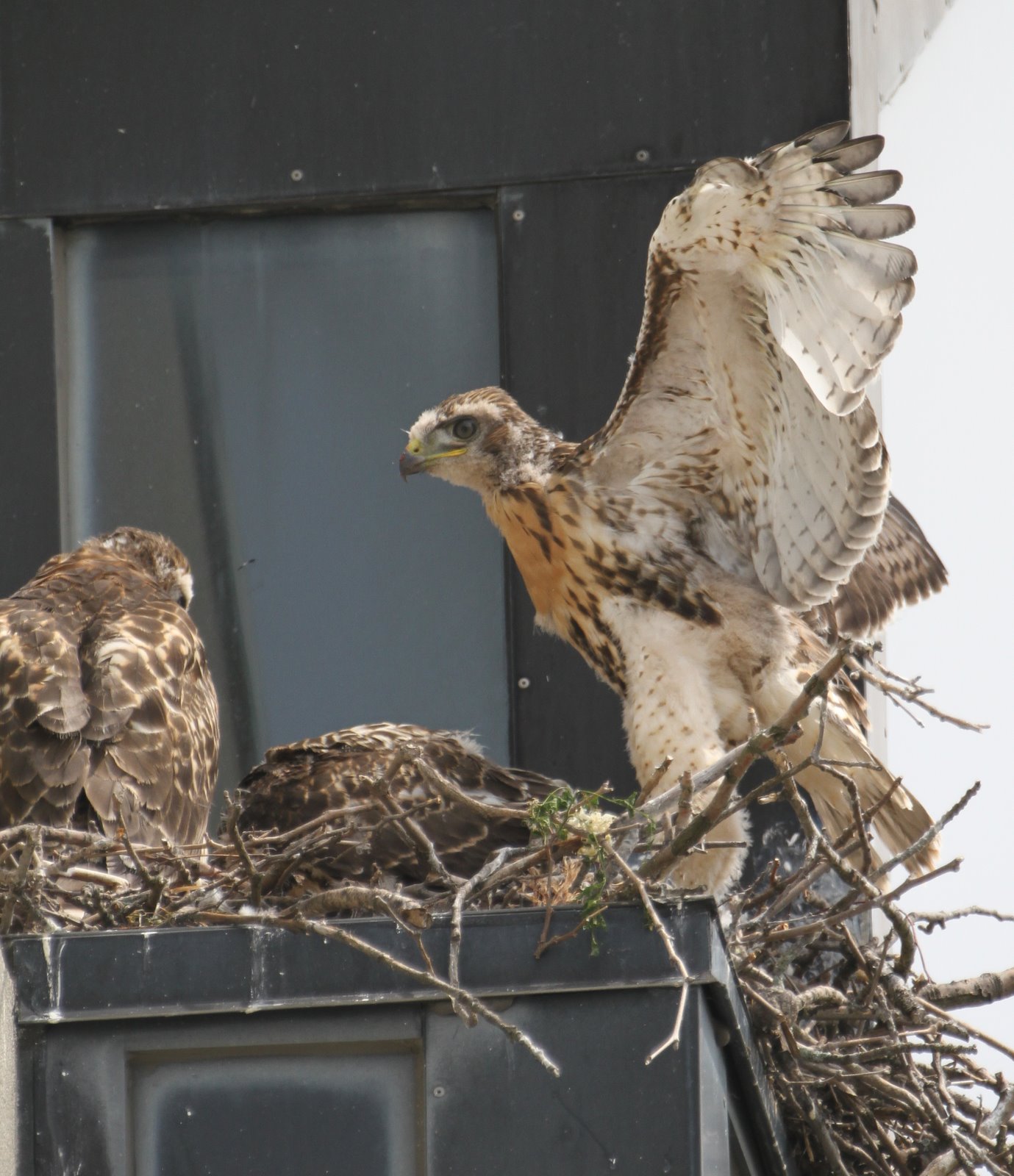These three baby Red Tailed Hawks have become local celebrities because their parents elected to build their nest on the side of a building near the Alewife T Station. They are 41 days old and expected to make their first flights today or tomorrow. Females of this species are 25% larger than the males leading me to believe that there are two girls and one boy. Dad made a pit stop with some food which was quickly devoured. After lunch the kids did a little wing testing.