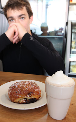 Hot chocolate and a freshly baked chocolate croissant, comparable to what he remembers from France, has Nicolai very happy with our choice of restaurant, The Butcher and the Baker. He is less pleased by the delay to his food enjoyment imposed by the taking of this photo.