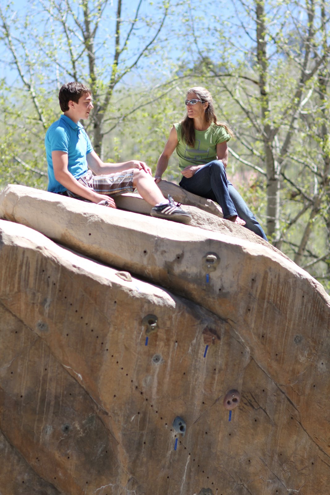 Although he does not know it at the time Nicolai shares the top of a climbing boulder and chats with Lynn Hill, generally regarded as the greatest female rock climber of all time.