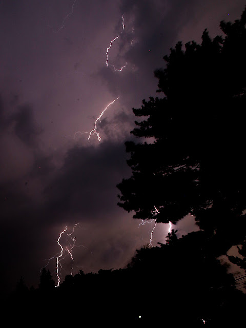 For several years I have tried to photograph lightning with little success. This evening it was striking almost every minute as severe weather moved quickly through Concord. The storm was responsible for at least four deaths in the state, knocked our power out for several hours and took down a huge tree section in our neighbors yard. Despite their potential for destruction, it was hard not to admire the beauty of the lightning strikes as they bridged heaven and earth with electricity. Nala did not care for the ensuing thunder and sought refuge in the basement.