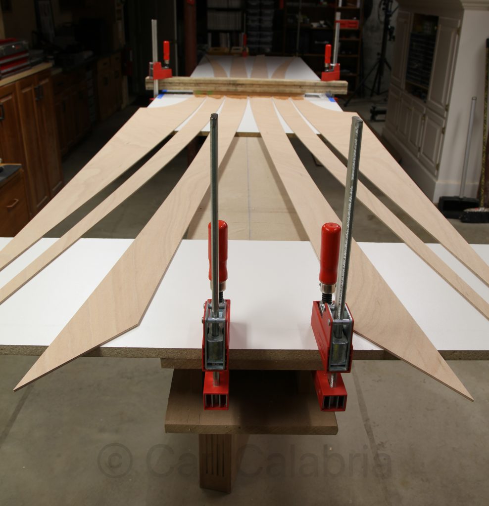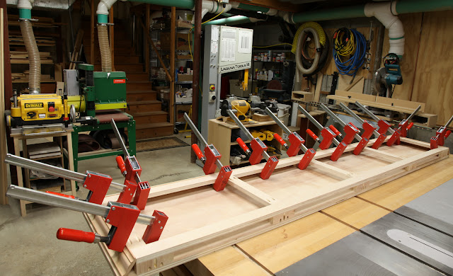 The media center project I have been working on has come together much faster than I expected. Usually, I plan such work in great detail. In this case, I started with a simple hand-drawn sketch and built one section of the 5 piece design at a time. The console will be shouldered by two bookcases connected by a bridge. The glue up shown here is of the crown molding top which will span both bookcases and the bridge.