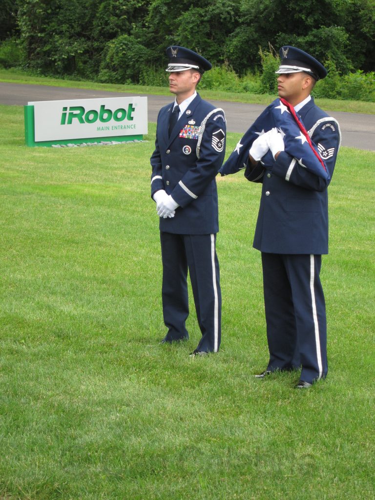 We honored our military veterans and customers today by dedicating a new flag pole which stands over the main entrance to iRobot headquarters. Our COO and retired Vice Admiral, Joe Dyer presided over the ceremony which included these honor guards who raised the flag in accordance with military tradition. It was a very patriotic affair and I am proud to be part of a company that places such importance on events such as this.