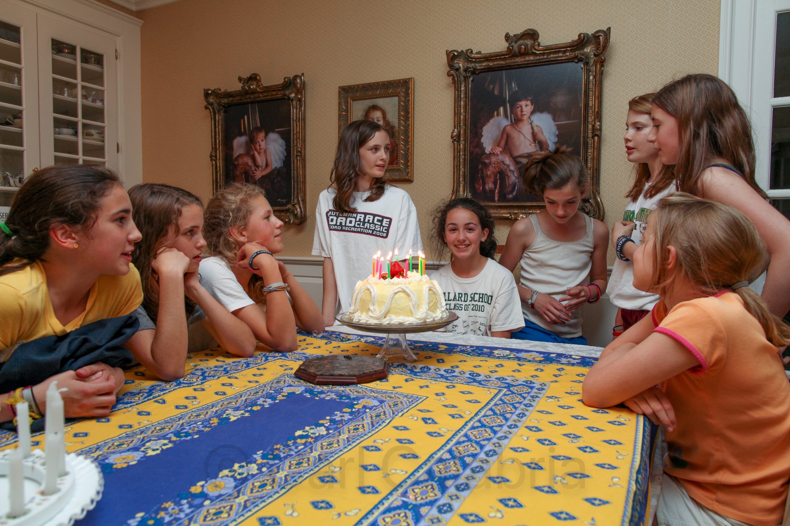 Maya turns twelve on Sunday and celebrated today with her friends. Nicolai contributed by designing and placing clues for a treasure hunt in downtown Concord where the party began. Returning home in advance of threatening rain the girls enjoyed playing volleyball outside before sitting down to a pulled pork sandwich/mac & cheese dinner followed by a Lemon Chiffon Funnel cake iced with real butter cream (made from scratch by Maya). The girls watched a movie before retiring to the basement for a slumber party. I was exhausted from the 22 mile round trip bike ride to/from work today and Jeanine from all the preparations for the party so we retired long before the girls did.