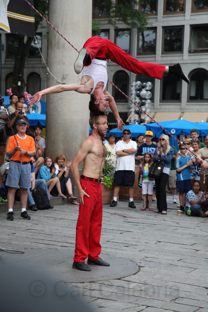 This evening we enjoyed a family outing to Faneuil Hall where we dined at Quincy Market’s MMMac & Cheese (they use Cavatappi pasta and a yummy blend of cheeses for an out of this world comfort food experience). We also took in a very entertaining street performance by the Red Trousers. Jeanine and Maya can be found in the background admiring this feat of strength and balance which was nothing compared to the humor of these two characters. Earlier in the day I survived the first half of our playoff finals before my injured quad/groin gave out completely. Although I was operating at half speed and could only kick with my left foot, I did contribute to our first goal when I crashed into the keeper on a 50/50 ball which squirted out towards the net. A defender used his hand to stop the ball and we scored on the resulting penalty kick. They equalized shortly before the end of the half knotting the score at 1-1. With 35 minutes left to play one of our players was given a red card (ejected) on a ridiculous call by a control freak referee who had no business officiating a league finals match. We had to finish the match with 10 players to their eleven and with no remaining subs to their 8. It was only a matter of time before they secured the winning goal. A disappointing end to an otherwise brilliant season. Thankfully I now have some time to heal from my accumulated injuries.