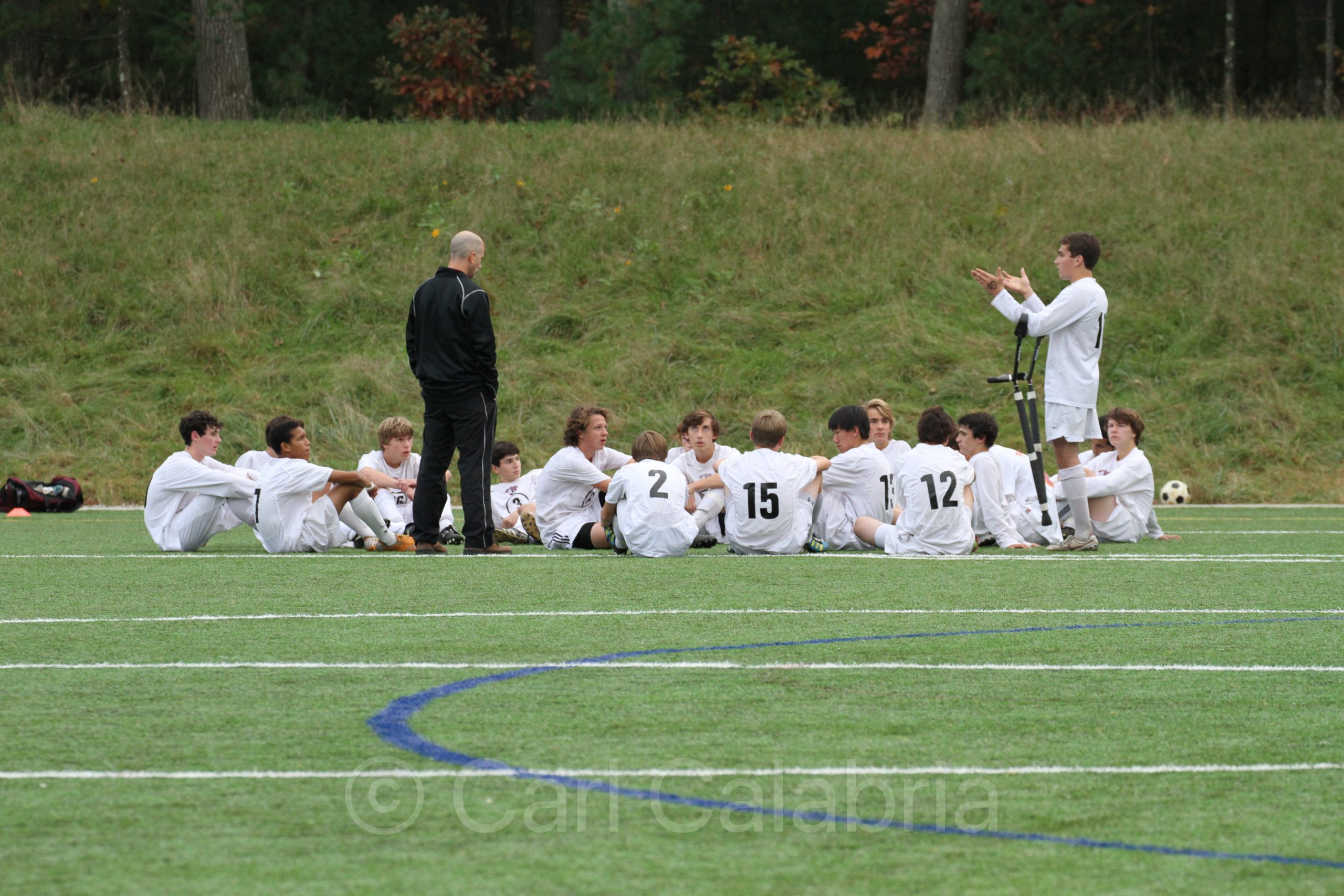 Maya is carried from the field by her coaches during today’s game against Lincoln Sudbury. She was kicked in and then twisted her right knee. The injury does not appear to be too serious but we iced it all day long as a precaution. Her team prevailed with a 3-1 result and all were happy to get out of the freezing cold for our post game detour to Dunkin Donuts. Nicolai spent the morning working as a referee and the afternoon doing community service with his church youth group. I prepared for a forecasted early season snow storm by getting the snow blower ready and installing snow sticks along the driveway contours.