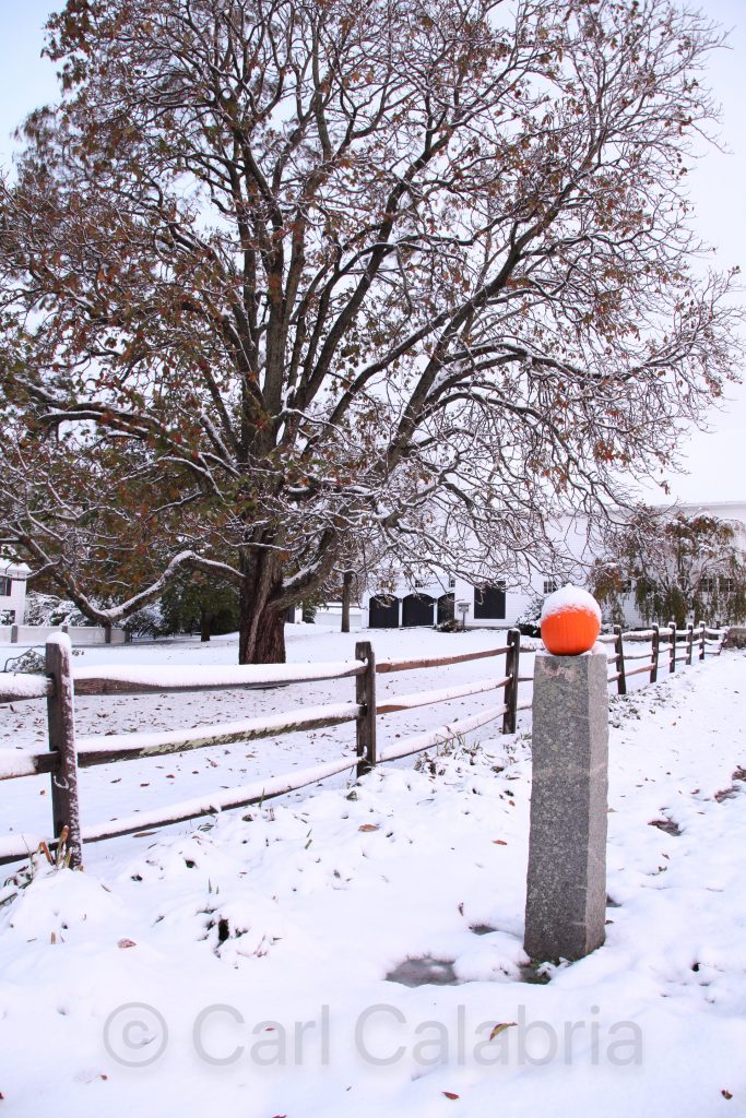This may be the first Halloween I can remember with snow. As a result, we had less than a dozen trick-or-treaters and a massive oversupply of candy which I was very tempted to personally rectify. Instead, I decided to bring all the excess to work and distribute there in a reverse trick-or-treat scenario. Pictured here is the horse farm across the street. I liked the punctuation of the orange pumpkin within the otherwise gray-scale scene.