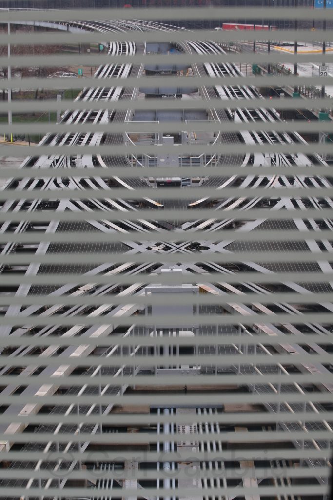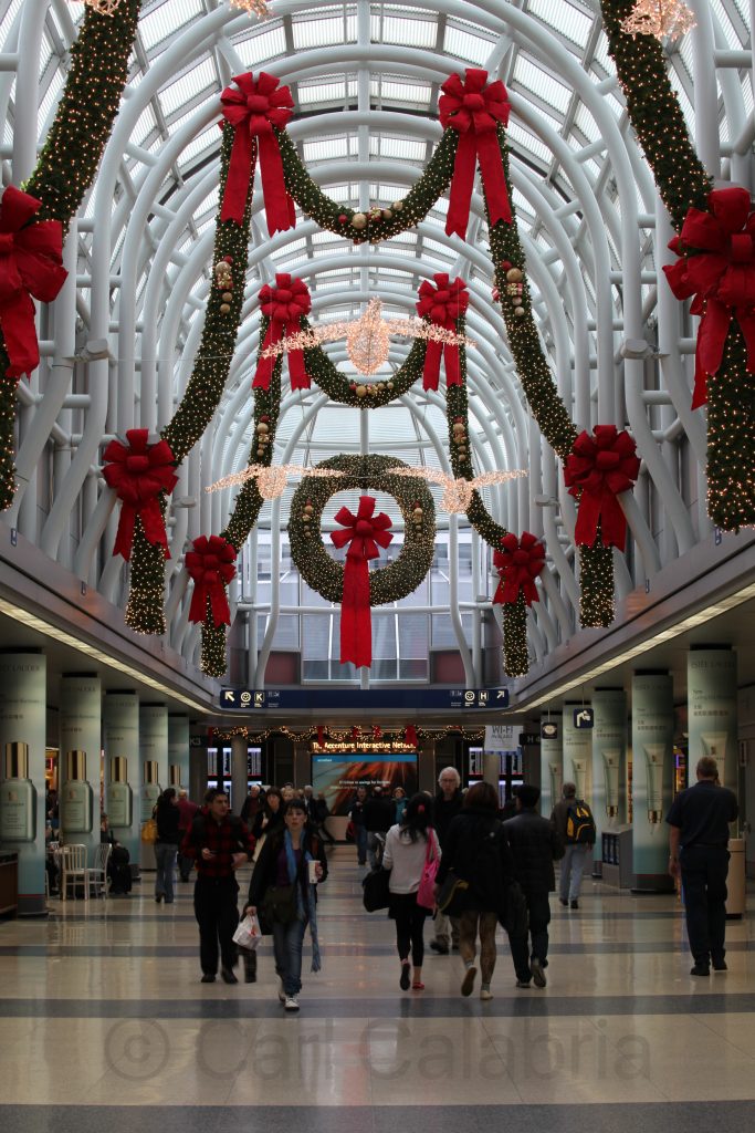 I began my travel to China early this morning with a flight to Chicago where the airport was decked out for the holidays. A three hour layover is followed by a 15 hour flight to Hong Kong arriving on Sunday eveningand where I will overnight before continuing on to China. With some time to kill at O’Hare, I searched our interesting photo opportunities and found this interesting view of the inter-terminal rail tracks as viewed through a frosted window from an overpass.