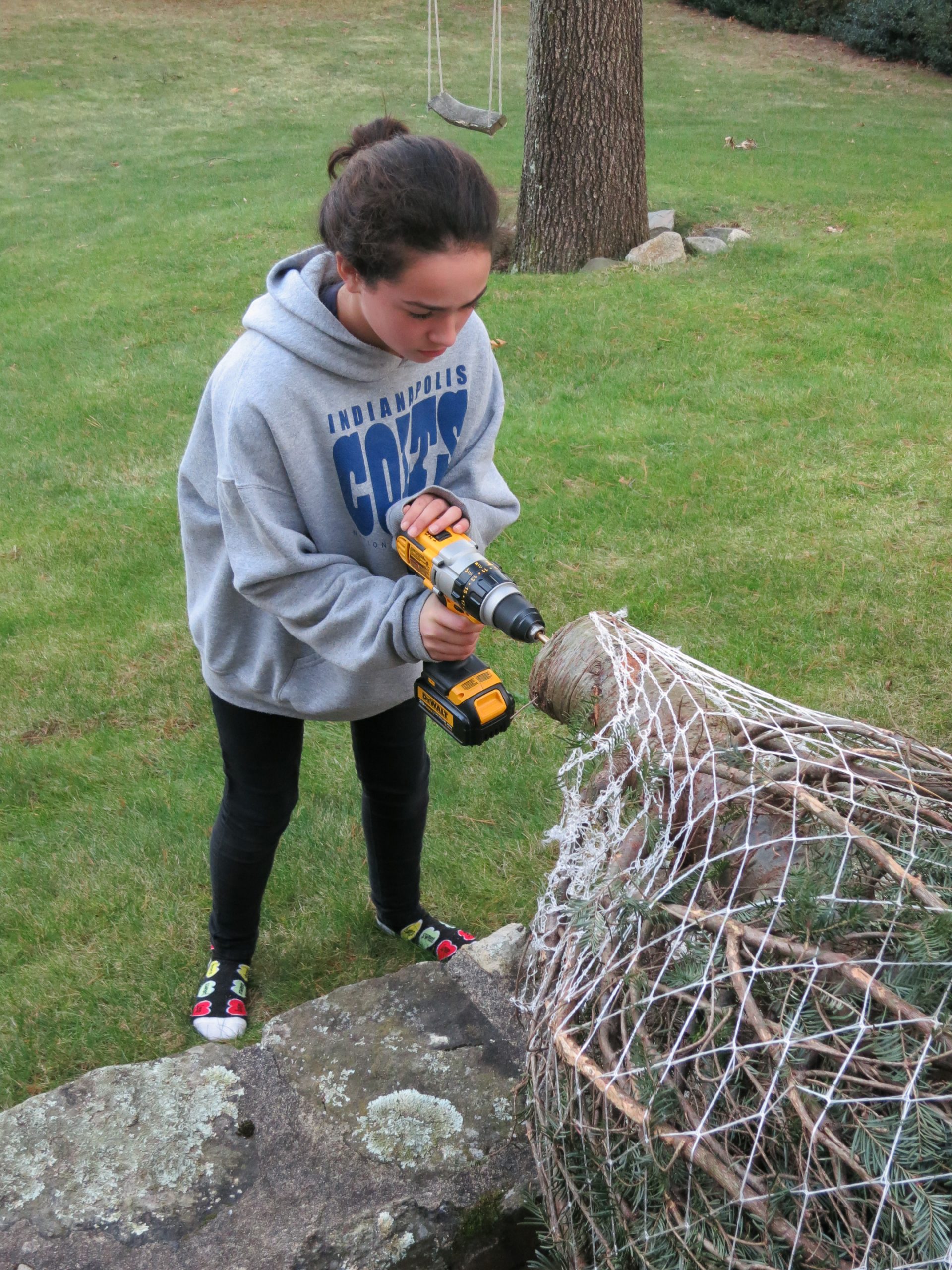 For the first time, the kids were totally responsible for the Christmas tree. All three piled into Kyle’s truck and drove to Mahoney’s where they located a perfect specimen. Maya drilled a hole in the base to prepare it for our stand and the whole family, including my mother who is feeling much better, trimmed the tree by the warmth of our first fire of the season.