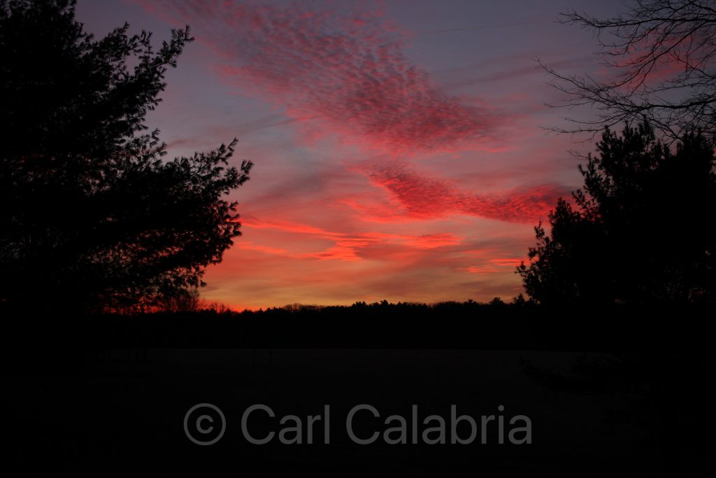 Every so often we are treated to a magnificent if fleeting sunrise. I have learned to run for my camera on such occasions as the intense colors can dissipate in a matter of seconds. With all of the activity over the weekend I returned to work today with my batteries only partially recharged and a longer than usual list of things to be done (the toll for Friday’s team building excursion). I didn’t return home until well past 8PM and opted for sleep over dinner.