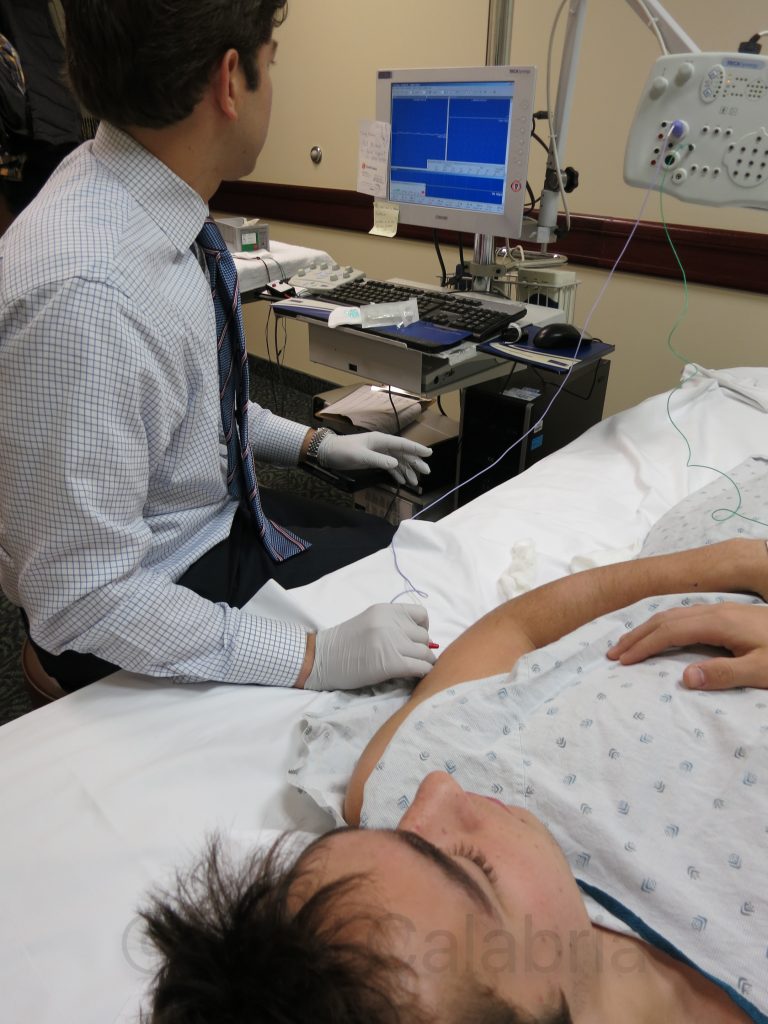 Nicolai and I made an early morning visit to Emerson hospital for additional testing to confirm that it is safe for him to return to wrestling. The first series of tests passed small electric currents through his body to confirm that his muscles were properly reacting to stimulus. The second series was far more painful. A tiny metal wire was placed deep (2 inches) into his muscles while the doctor monitored the electrical signals present when he flexed the muscles. The good news is that the test appears to confirm an absence of nerve damage or muscle weakness.