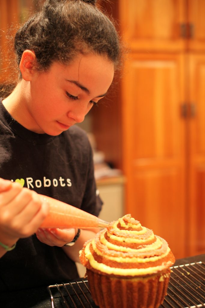 Maya, over the course of the day, baked and decorated a giant cupcake utilizing a special mold she received as a Christmas present from her Aunt Lauren. The resulting treat was quickly devoured by a small army of boys (friends of Kyle and Nicolai who were gathered at the house) and members of the family except for Nico who is dieting to make a target weight of 112 pounds.
