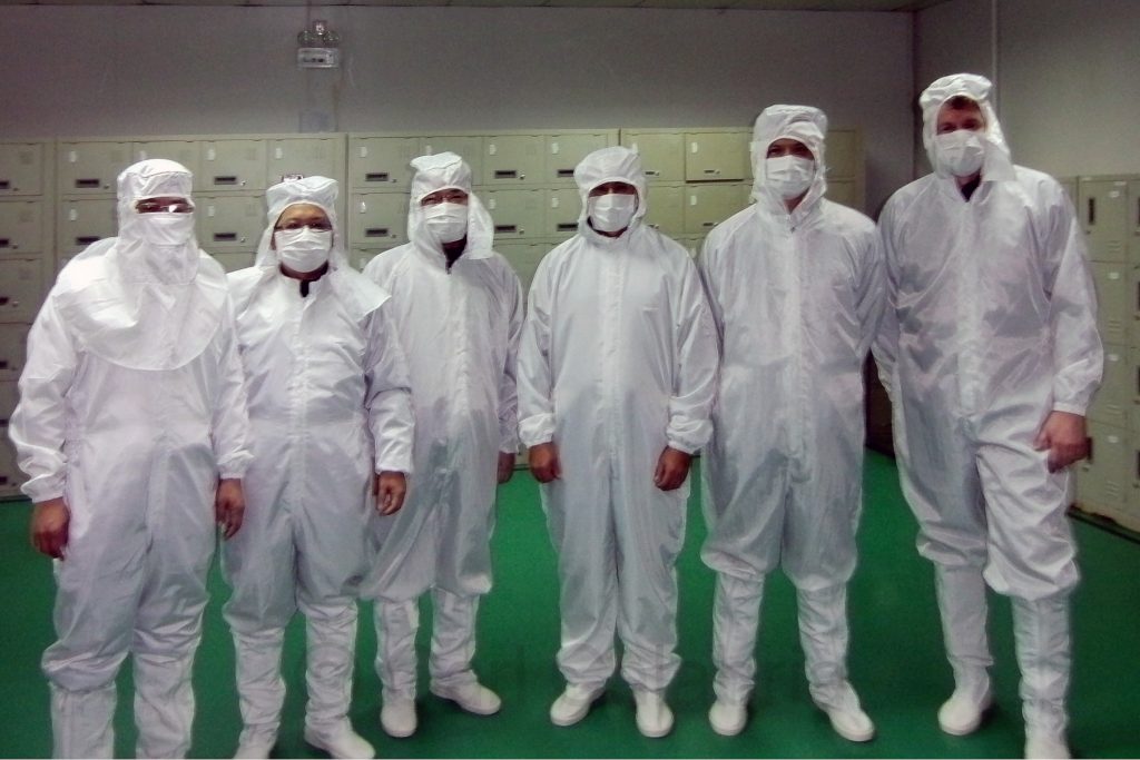 One of my main objectives on this trip to China was to learn more about injection molding of plastic parts which are used extensively in iRobot products. Today we toured a subsidiary of Jabil which is focused largely on molding and painting of plastic components. Before entering the production area for vacuum deposition we were required to change into the outfits pictured here to minimize the introduction of contaminants. Photography within the plant is forbidden but our host graciously offered to take this picture for us.